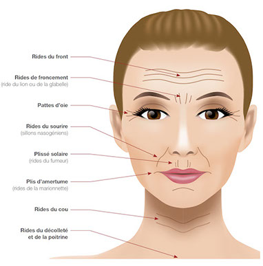 La contraction des muscles laisse des rides et des sillons sur le visage. Avec le temps et la répétition, ces empreintes deviennent permanentes. On les appelle alors rides d’expression. L’illustration suivante en présente la liste.