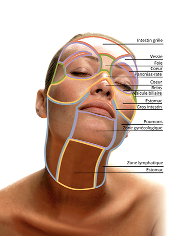 La médecine orientale nous apprend que l’énergie des organes du corps se reflète sur des zones précises du visage (voir l’illustration ci-dessous).